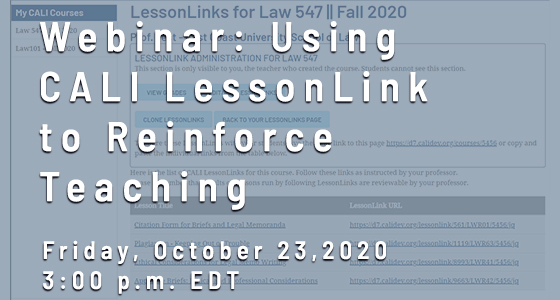 Join the CALI staff for this Zoom webinar to see the latest updates to the CALI LessonLink system and learn about how to use LessonLink to assign CALI Lessons to your students as part of your course. LessonLink allows law faculty to assign CALI Lessons to students and track students' grades and performance.
